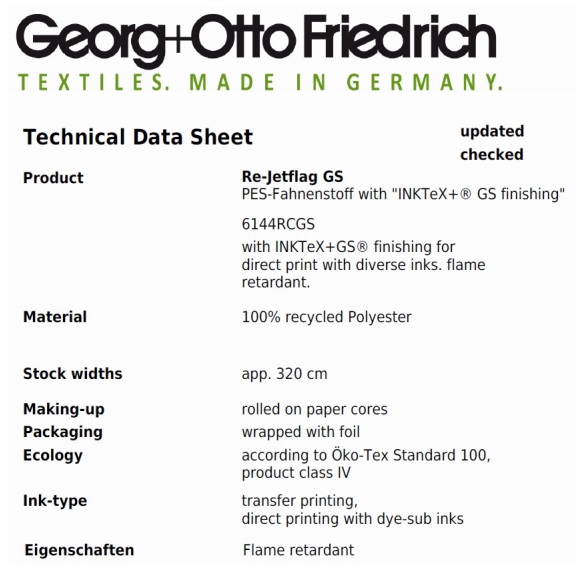 Digitaal gedrukte mastvlaggen op 115 gr eco polyglans B1 (brandvertragend), vervaardigd van gerecycled polyester waaronder PET-flessen (zie materiaal omschrijving en certificaat). Vlag is verder volledig geconfectioneerd en aan de mastzijde voorzien van kopband, leuvers en clips. U dient een drukklaar bestand aan te leveren op basis van het gewenste formaat. Wij controleren uw drukbestand en sturen u (indien gewenst) eerst een drukproef voor goedkeuring waarna wij tot drukken overgaan. Heeft u geen drukbestand dan kunnen wij tegen meerprijs deze voor u opmaken. Minimale bestelhoeveelheid is 5 stuks.